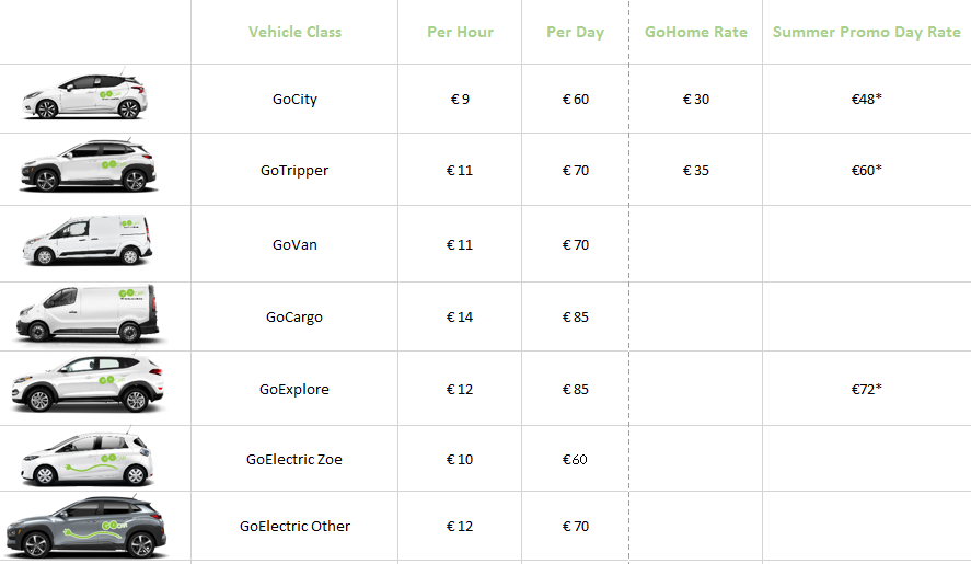 - GoCity vehicles will move to €9 per hour, instead of €8