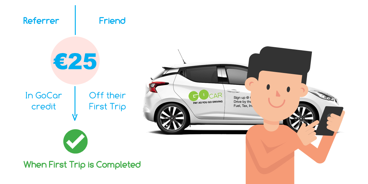 Your friend simply enters in the referral code when creating their own GoCar account and €25 credit will trigger on completion of your friend’s first trip! Simples 👌